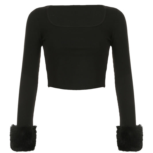 Square Collar Sexy Furry Long-sleeved Crop Top